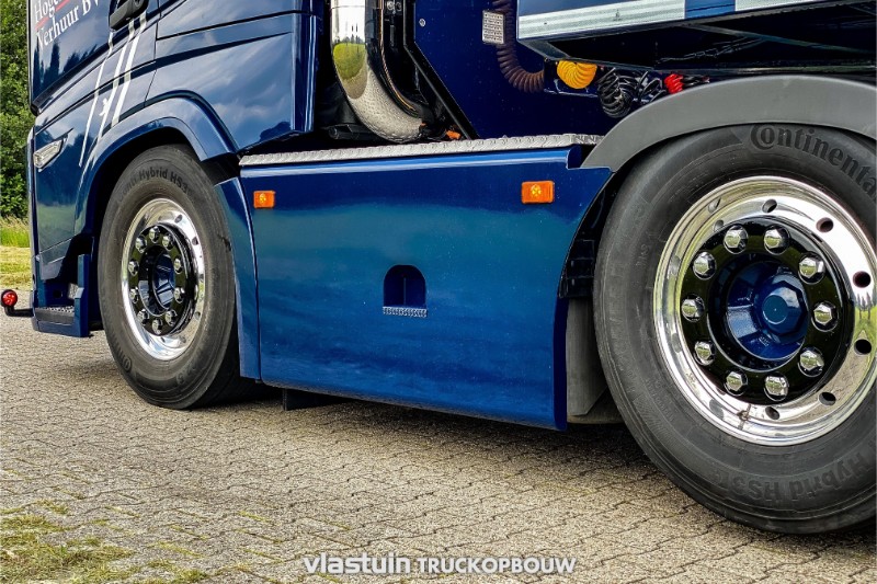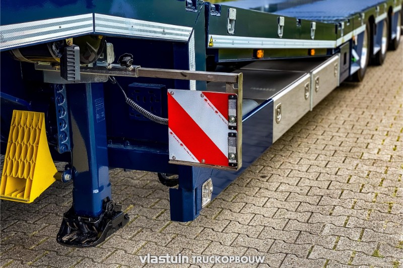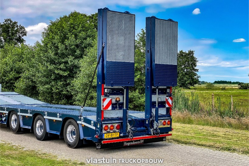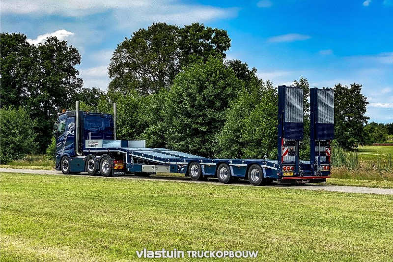We delivered this complete tractor-trailer combination to Hogendoorn Verhuur B.V. This is a new 3-axle extendable VTR trailer. It is equipped with 2 hydraulically steered axles, a liftable axle, various storage options, a hydraulic lifting bed and hydraulic ramps for easy loading and transport of their own various machines. This VTR trailer is linked to a young used Scania Volvo FH 6×2, we have customized the truck to the personal taste of the customer. For example, it is built with standing exhausts with a hose rack, complete deck on the chassis, strings between the axles, side plates, an aluminum sun visor and matching roof accessories. In addition to the build, we also provided the complete paint job.