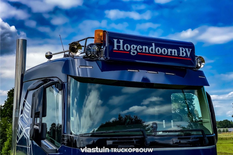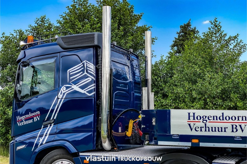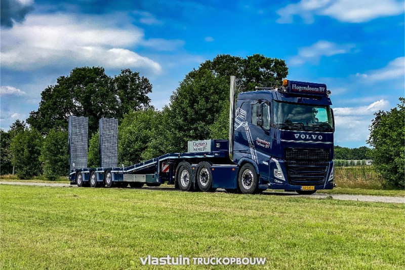 Aan Hogendoorn Verhuur B.V. hebben we deze complete trekker-oplegger combinatie geleverd. Het betreft hier een nieuwe 3-assige uitschuifbare VTR trailer. Deze is onder andere uitgerust met 2 hydraulisch gestuurde assen, een liftbare as, diverse opbergmogelijkheden, een hydraulisch hefbed en hydraulische oprijkleppen voor gemakkelijke belading en transport van hun eigen machines. Voor deze VTR trailer staat een jong gebruikte Volvo FH 6×2, de truck hebben we aangepast naar de persoonlijke smaak van de klant. Zo is deze onder andere opgebouwd met staande uitlaten met een slangenrek, complete vlonder op het chassis, stringen tussen de assen, zijplaten, een aluminium zonneklep en een passende dak opbouw. Naast de opbouw hebben we ook het complete spuitwerk verzorgd.