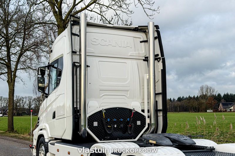 For Van Triest Trucks B.V. we built this 770ST number 112. We built up the truck with a roof bar with spotlights and a lightbox, air horns, upright exhausts, a hose rack, bumper spoiler, width lights, work lights, strings between the axles and a catwalk over the chassis.