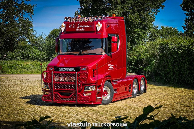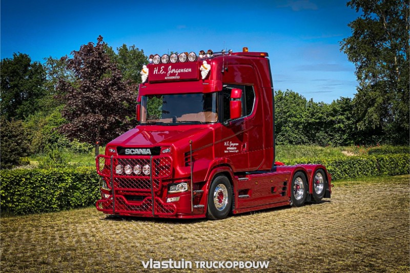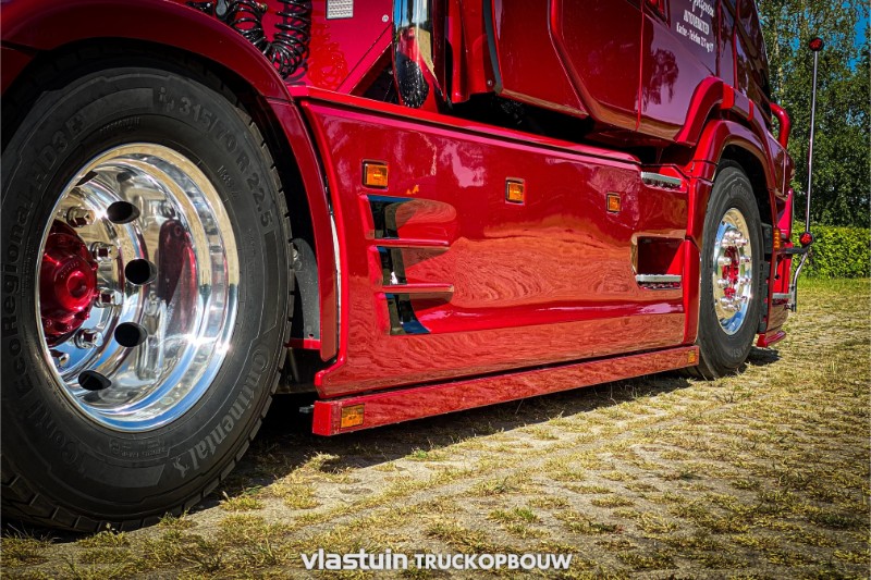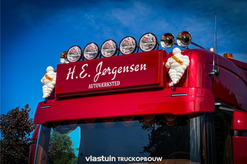We have built this beautiful Scania 660ST no. 91 for HEJ Trucks from Denmark. As can be seen in the pictures, the complete conversion to torpedo, the built, extra lighting and all accessories were realized by us. The Scania in the color Ruby Red in combination with the special paint makes this a unique appearance.