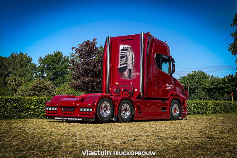 Voor HEJ Trucks uit Denemarken hebben we deze prachtige Scania 660ST nr. 91 gebouwd. Zoals te zien op de foto’s is de complete ombouw naar torpedo, de opbouw, extra verlichting en alle accessoires door ons gerealiseerd. De Scania in de kleur Ruby Red in combinatie met het special paint maakt dit een unieke verschijning.