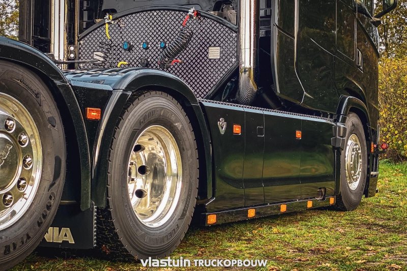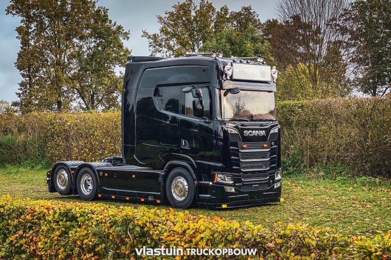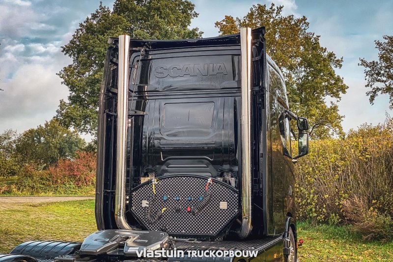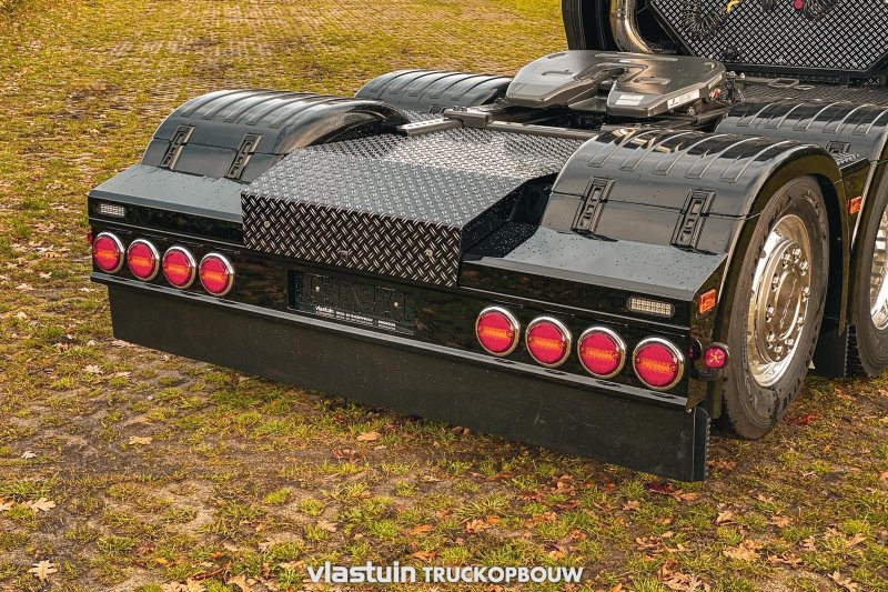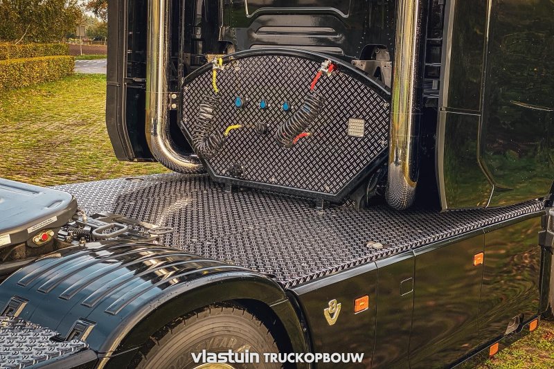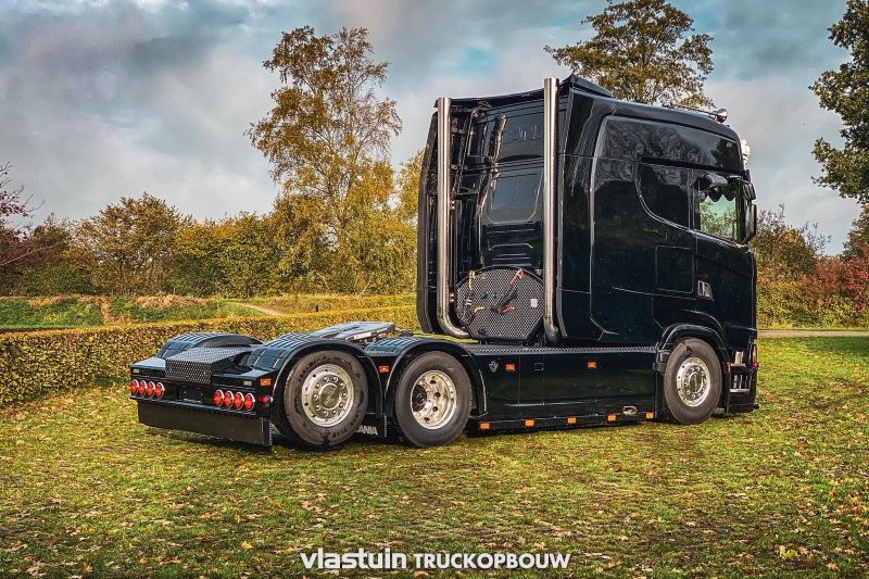 We built this Scania S660 Longline for Van Triest Trucks B.V. This concerns an XXL extension of 100cm. Besides extending the cab, we also fitted this truck with upright exhausts, a hose rack, a complete catwalk on the chassis, and a rear bumper.