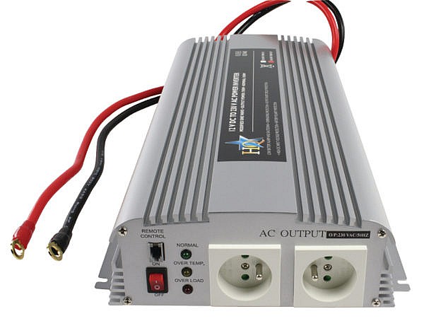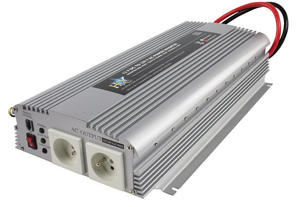 24 naar 220 volt omvormer. Gedurende een tijdsduur van maximaal 30 minuten kan deze gemodificeerde sinus-omvormer een vermogen van maar liefst 1700 Watt leveren. Onbeperkt (continu) vermogen is 1500 Watt en het piekvermogen maar liefst 3000 Watt.
