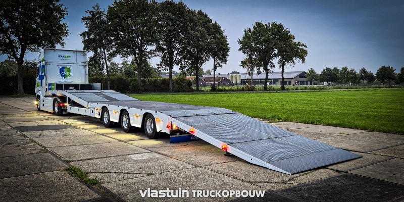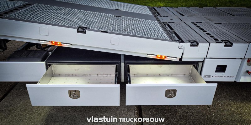We delivered this new VTR trailer to Logistic Partner. It’s equipped with two hydraulically steered axles, a liftable axle, various storage options, a hydraulic lifting bed, and hydraulic ramps. This trailer has also been customized with features including double-burner marker lights, 15 work lights per side, and different rear lights with led bars underneath.