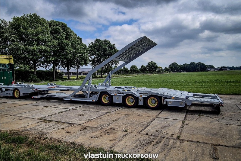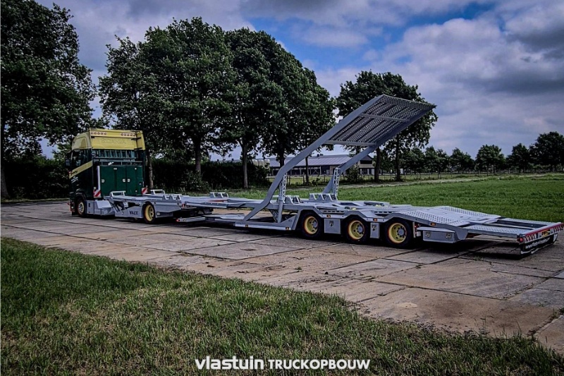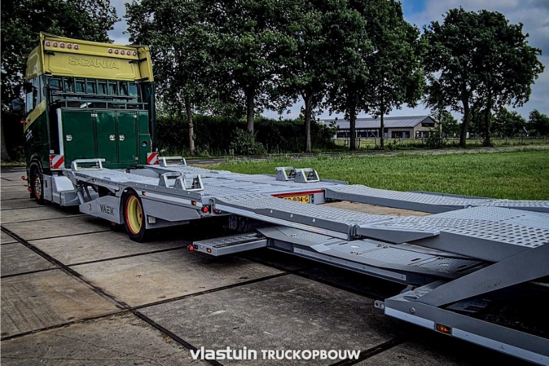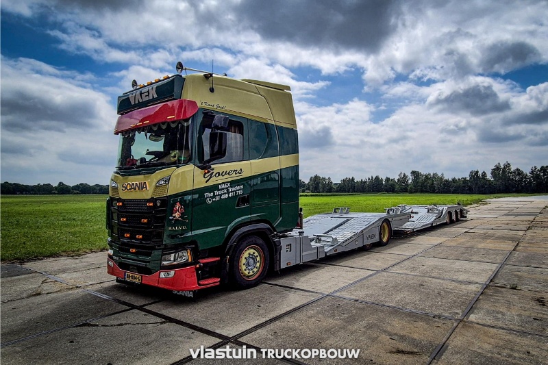 Voor onze gewaardeerde relatie Vaex Truck Trading B.V. hebben we deze Scania S-serie voorzien van een vooroverlaad carrosserie in combinatie met een VTR AM-2400 aanhanger. Deze combinatie is door hydraulische hefbedden en uitschuifbare bumpers voor meerdere doeleinde ingericht, waaronder het vervoeren van landbouwvoertuigen, machines, auto’s en trucks. De combinatie is opgebouwd naar wens van de klant met onder meer een lift as, meerdere opbergkisten en zijn de brandstoftanks weggewerkt in de carrosserie. Bovendien is het gehele chassis dicht gebouwd en voorzien van ingebouwde werklampen in de laadvloer om het laden en lossen te vereenvoudigen.