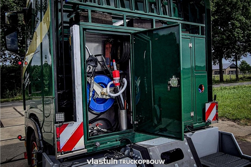 For our valued relationship Vaex Truck Trading B.V. we have equipped this Scania S-serie with a frontloaded body in combination with a VTR AM-2400 trailer. The combination is built according to the customer’s wishes with, among other things, a lift axle, multiple storage boxes and the fuel tanks are concealed in the body. In addition, the entire chassis is built closed and equipped with built-in work lights in the loading floor to simplify loading and unloading.
